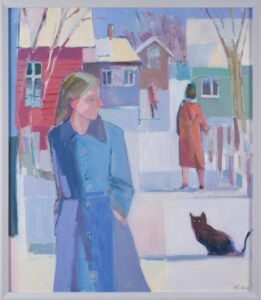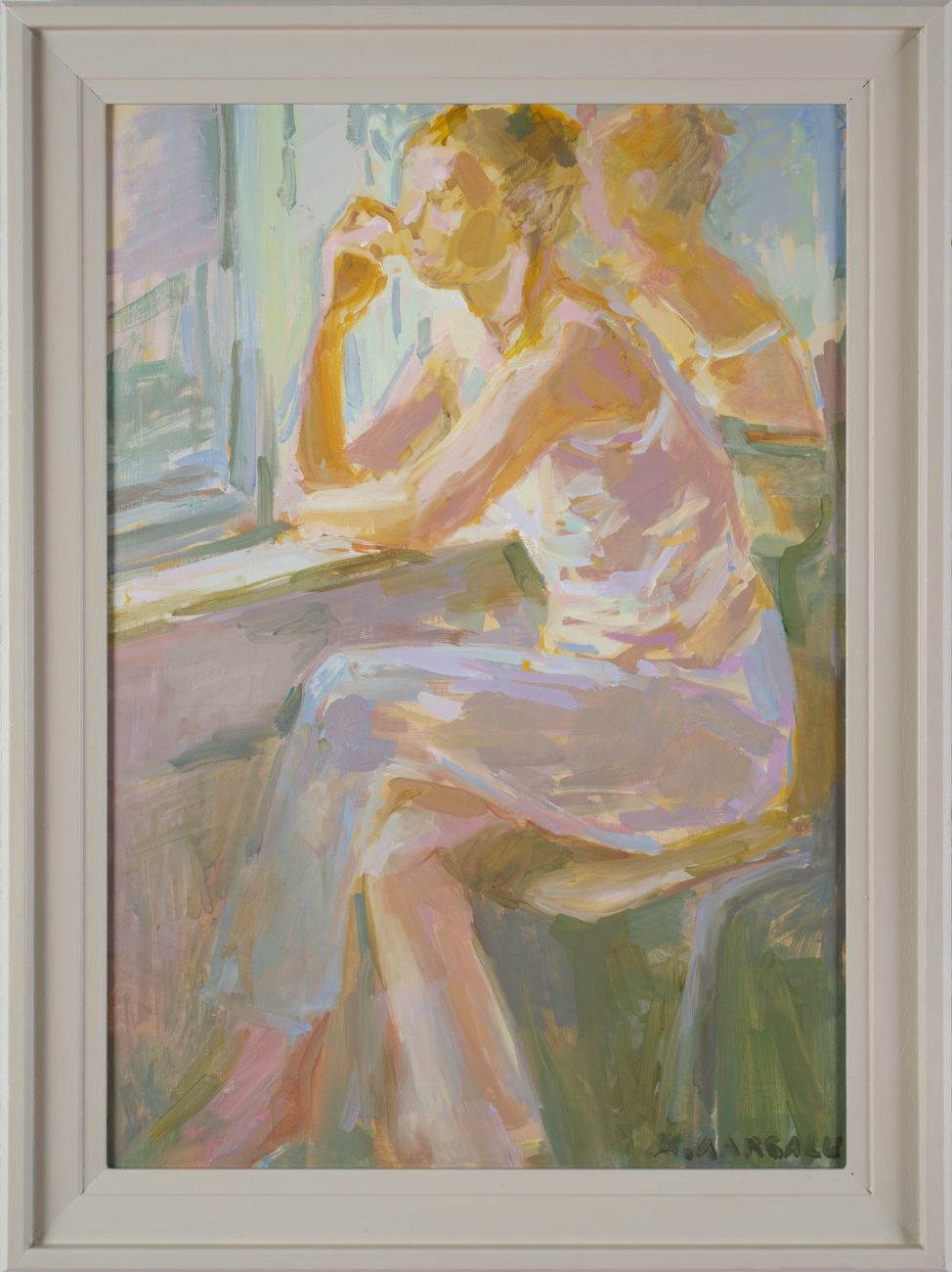 Pastelsetes toonides aknal mõtisklev naisfiguur. Minevikku ei saa unustada ega maha matta, see käib meiega alati kaasas. See peegeldub meie hetke elus ja määrab meie tuleviku. Selle tõdemusega saame vaid leppida ning oma peegelpildiga rahu teha. Nauditav pallaslik toonimäng.