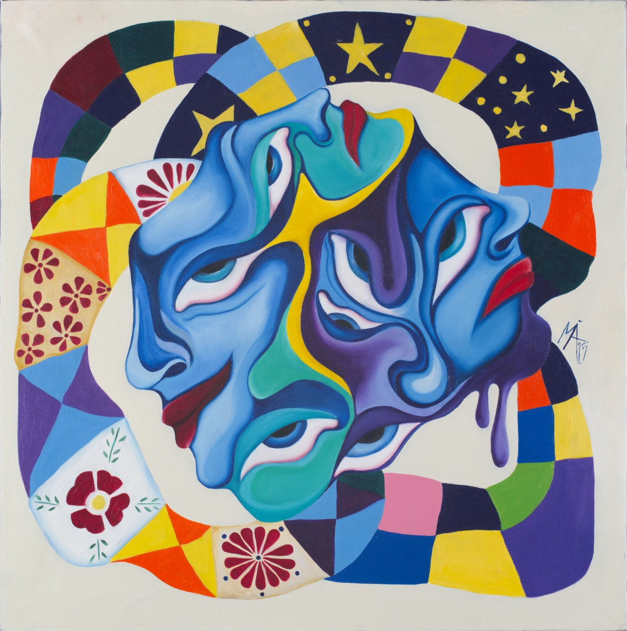 Värviliste nägude segapundar, mis on saanud inspiratsiooni kunstniku vanaema tehtud lapitekkidest. Nostalgiline maal, kus sulanduvad kokku kunstniku mälestused erinevatest eluhetkedest lapitekkide vahel.