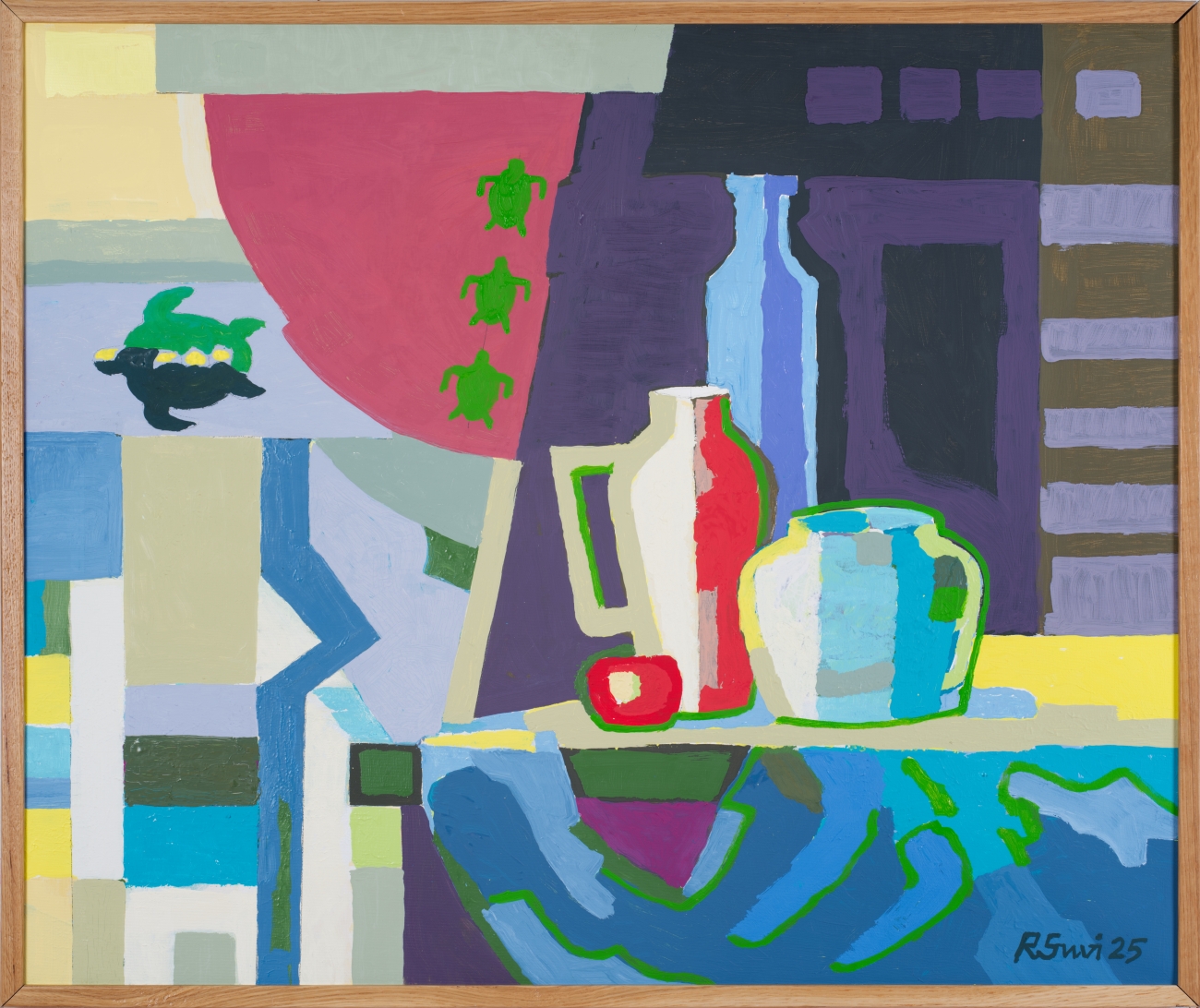 Pealtnäha lihtsale ja suviliku geometrisatsiooniga üles ehitatud natüürmordile lisavad kerge vimka kilpkonna kujutised. Kuigi autor mängib juba esemete kujundamise juures tahtlikult kahe- ja kolmemõõtmelisuse piiriga, seavad loomakesed seda veelgi enam küsimuse alla, sest tekitavad tunde, et kõik nähtu on vaid muster.
