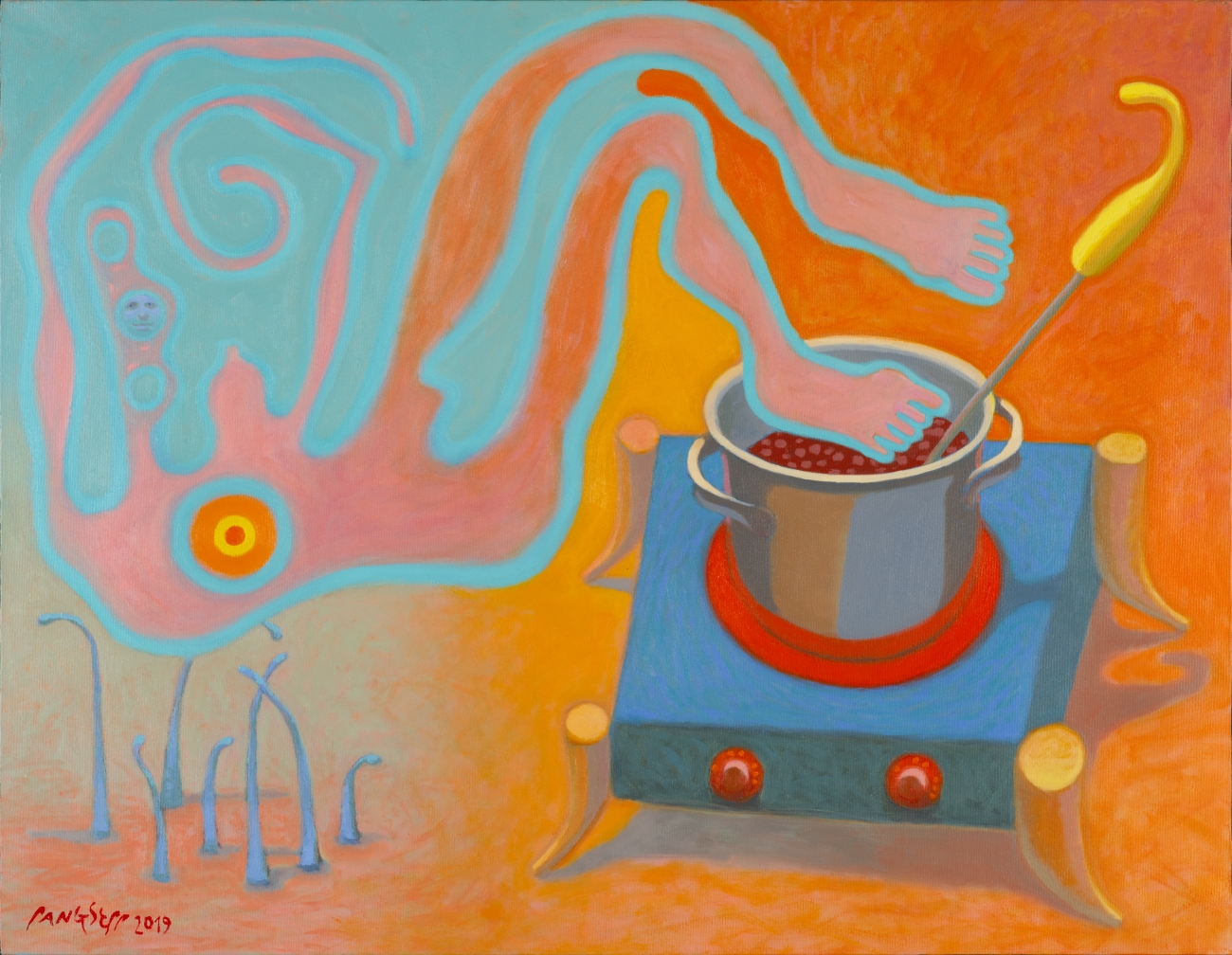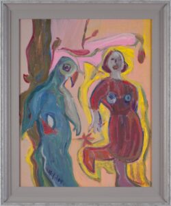 Maalil on kohal kõik Ijavoinenile omased figuurid, mis korduvad nii tema lõuendeil kui skulptuurides. Pigem saabki siin rääkida kunstnikule isikupärasest omailmast ja seega ka omamütoloogiast. Efektse värvivalikuga kergelt abstraktsusse kalduv maal.