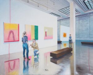 Gordini maalidel kujutatud sündmused leiavad aset kaasaegse kunsti maailmas. Autor vaatab seal toimuvat läbi kõverpeegli, mis paljastab, et sageli on kõik vägagi pinnapealne. Maalil toimub läikiva betoonpõrandaga kunstitemplis kallima käe palumine, kuid suursugune keskkond ei taga sugugi positiivset vastust. Ehk on viga liiga abstraktsetes maalides?